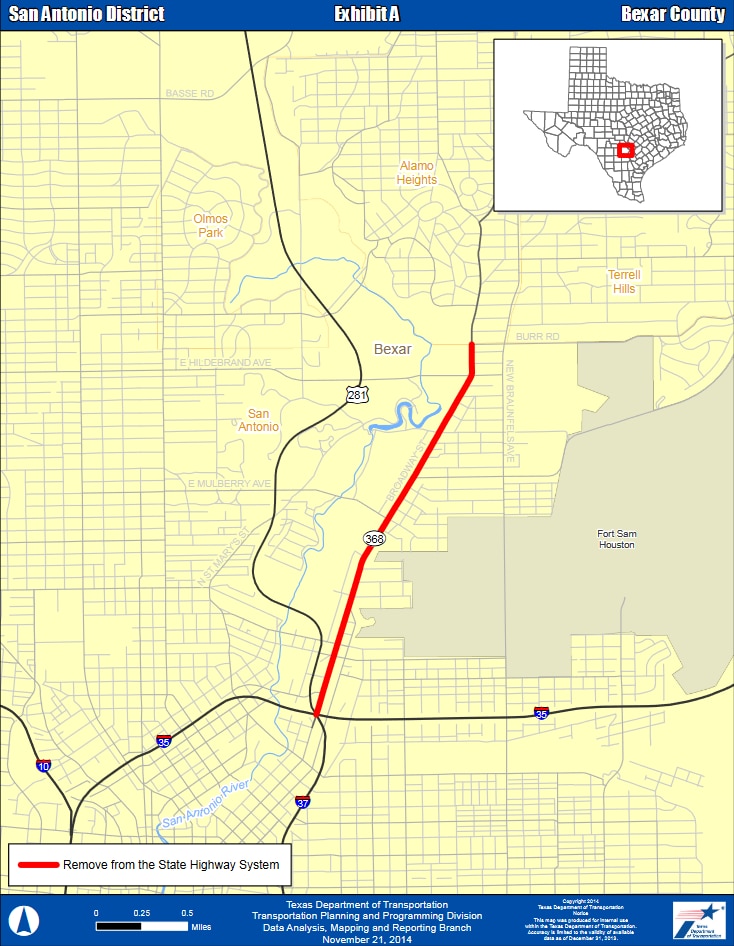 The Texas Transportation Commission, which oversees TxDOT, is scheduled to vote Thursday to rescind orders from December 2014 and February 2015 that allowed the transfer of a stretch of State Loop 368 to the City of San Antonio. That portion of state highway between between I-35 and Burr Road, at the Alamo Heights City Limits, overlaps with Broadway.