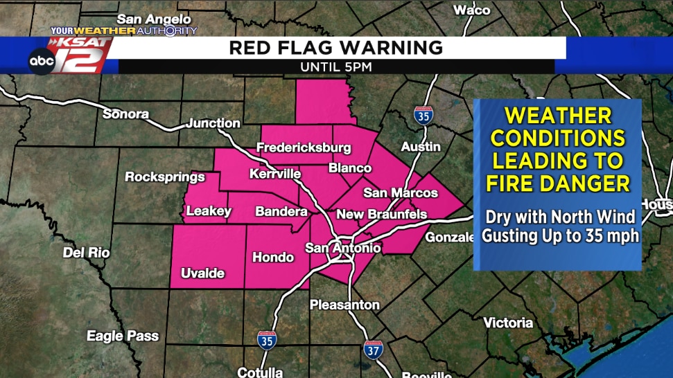 The National Weather Service issued a Red Flag Warning until 5 p.m. Tuesday for Bexar, Llano, Real, Kerr, Bandera, Gillespie, Kendall, Blanco, Hays, Uvalde, Medina, Comal, Guadalupe, and Caldwell counties.
