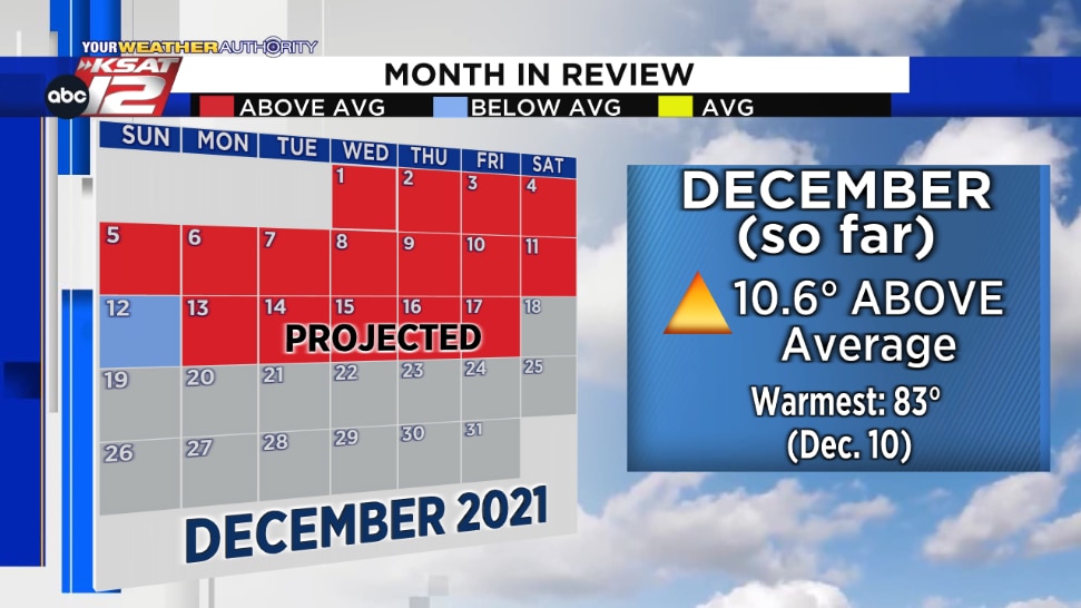 On Friday, December 10, San Antonio reached a high of 83°, with some areas in the 90s! And our average temperature is running 10.6° above normal. But as much as some may be hoping for colder weather, this week will feature high humidity and temps near 80°.