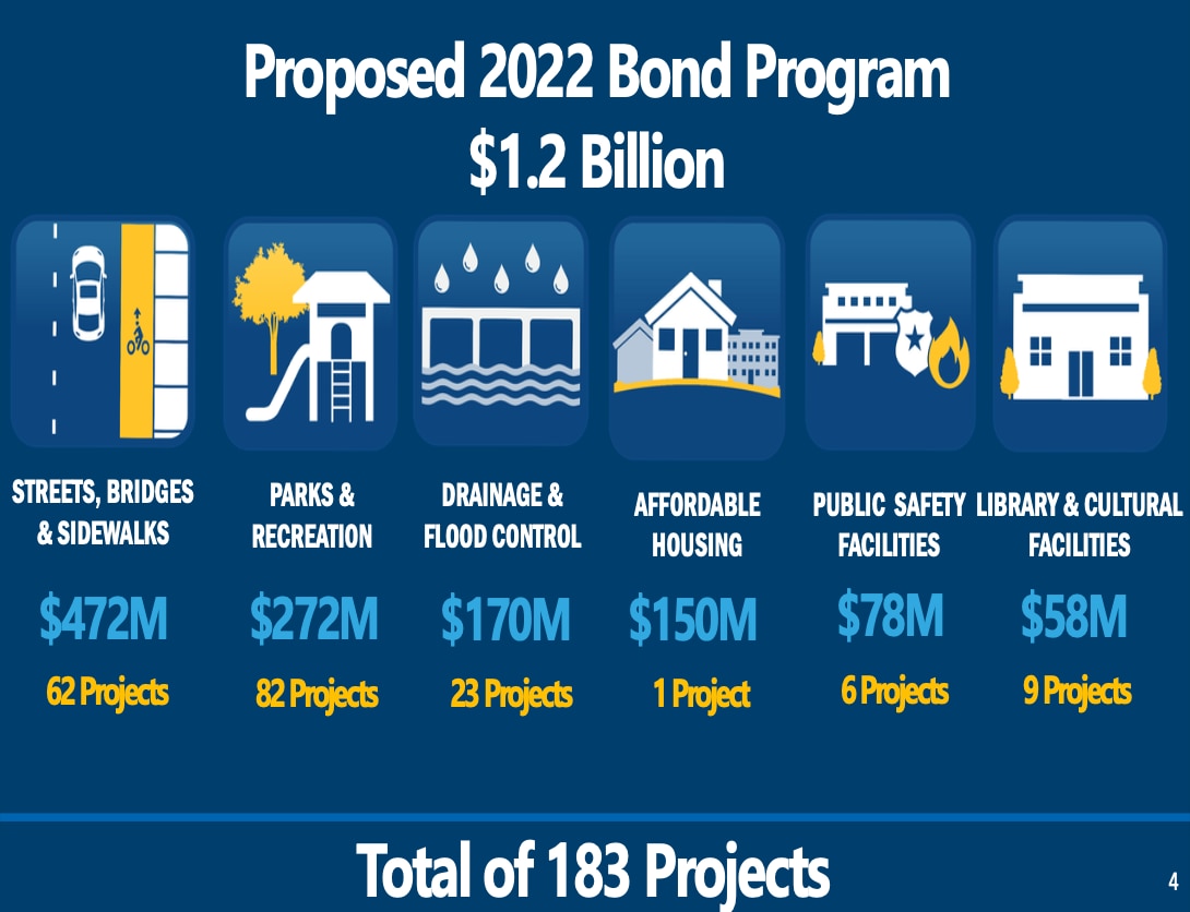 Streets, bridges, and sidewalks – $471.6MParks and recreation – $271.9MDrainage and flood control – $169.9MAffordable housing – $150MPublic Safety Facilities – $78.3MLibrary and Cultural Facilities – $58.4M