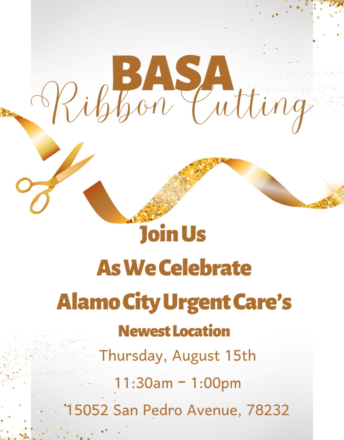 Ribbon Cutting @Alamo City Urgent Care San Pedro Help us celebrate our newest member location! + Add to Google Calendar + iCal / Outlook export The event is finished. Date Aug 15 2024 Expired! Time 11:30 pm - 11:30 pm Local Time Timezone: America/New_York Date: Aug 16 2024 Time: 1:30 am - 1:30 am Location Color Me Mine 11255 Huebner Road, St. 108, Category All Chapters Free Events Ribbon Cutting Share this event