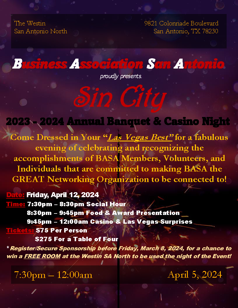 BASA Annual Banquet Business Association San Antonio proudly presents. Sin City 2023 – 2024 Annual Banquet + Add to Google Calendar + iCal / Outlook export The event is finished. Date Apr 12 2024 Expired! Time 7:30 pm - 11:55 pm Local Time Timezone: America/New_York Date: Apr 12 - 13 2024 Time: 9:30 pm - 1:55 am Location The Westin 9821 Colonnade Blvd Category All Chapters Paid Events Share this event