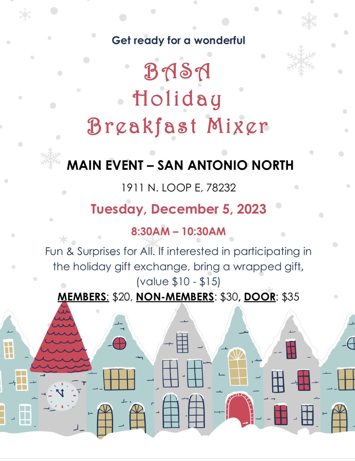 BASA Holiday Breakfast Mixer @ Main Event Come celebrate the holiday with BASA! + Add to Google Calendar + iCal / Outlook export The event is finished. Date Dec 05 2023 Expired! Time 8:30 am - 10:30 am Local Time Timezone: America/New_York Date: Dec 05 2023 Time: 9:30 am - 11:30 am Location Main Event Entertainment 1911 N loop 1604, 78259 Category All Chapters Paid Events Share this event