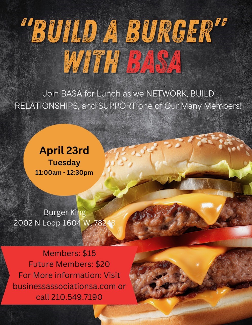 Build a Burger with BASA + Add to Google Calendar + iCal / Outlook export The event is finished. Date Apr 23 2024 Expired! Time 11:00 am - 12:30 pm Local Time Timezone: America/New_York Date: Apr 23 2024 Time: 1:00 pm - 2:30 pm Location Burger King 22119 Bulverde Road, San Antonio, TX, USA Category All Chapters Share this event