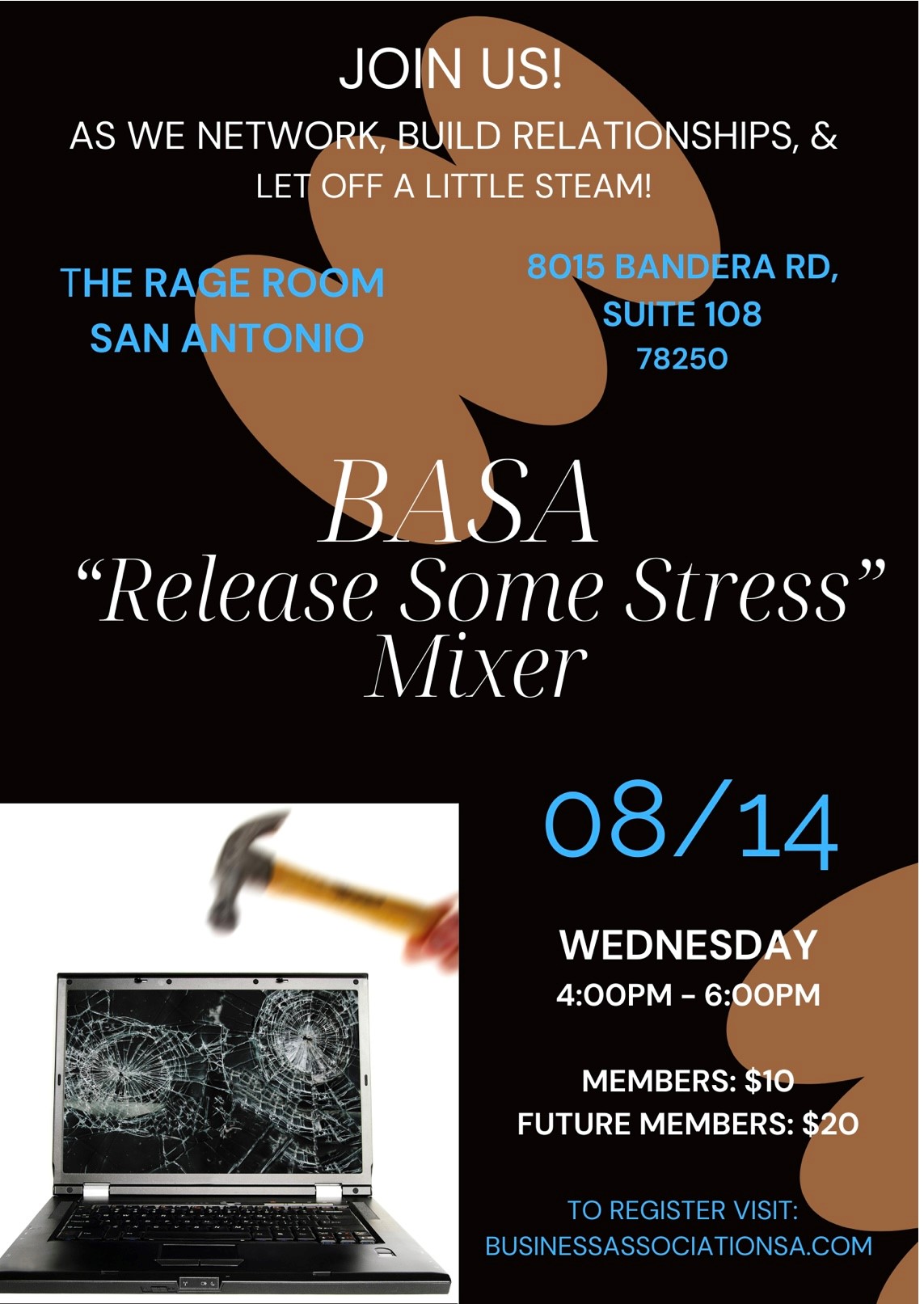 Release Your Stress Mixer @The Rage Room Blow off some steam and break some stuff while networking with BASA! + Add to Google Calendar + iCal / Outlook export The event is finished. Date Aug 14 2024 Expired! Time 4:00 am - 6:00 pm Local Time Timezone: America/New_York Date: Aug 14 2024 Time: 6:00 am - 8:00 pm Location The Rage Room 8015 Bandera Rd, Suite 108, San Antonio, TX 78250 Share this event X